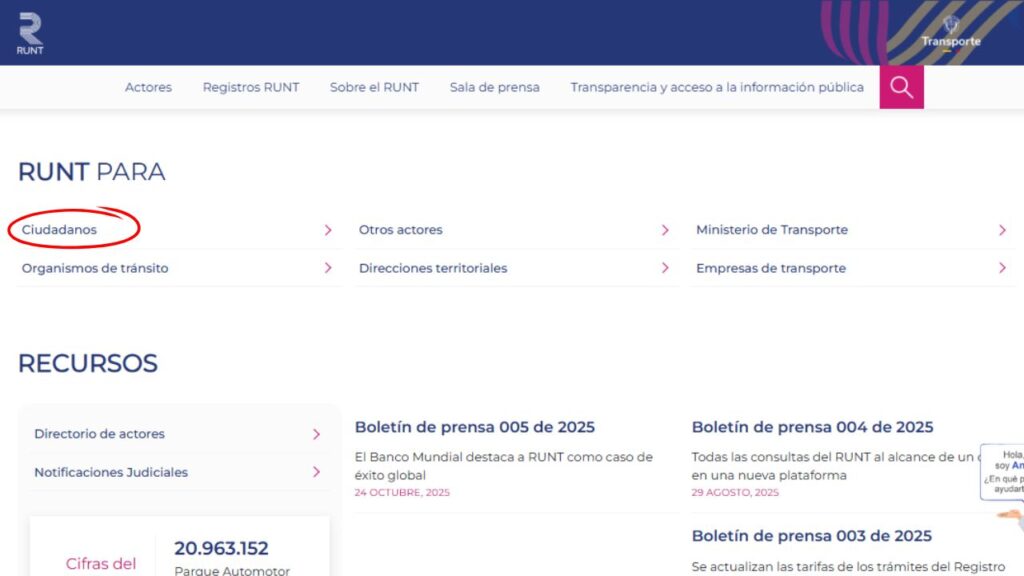 En la sección “Ciudadanos”, puedes acceder a consultas por placa o cédula, historial del vehículo o del conductor, certificados y otros trámites relacionados.